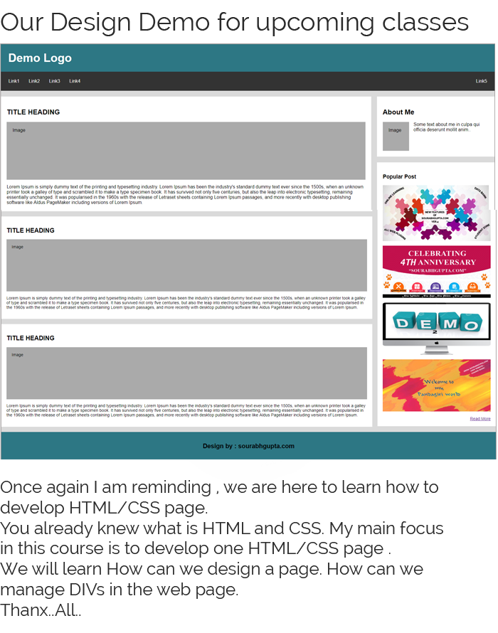 I am not going to teach you HTML And CSS, You can learn from any where. I would recoommend you w3chools.com, this website is basic for all beginners. I am going to teach you how can you design a webspage with HTMNLand CSS.